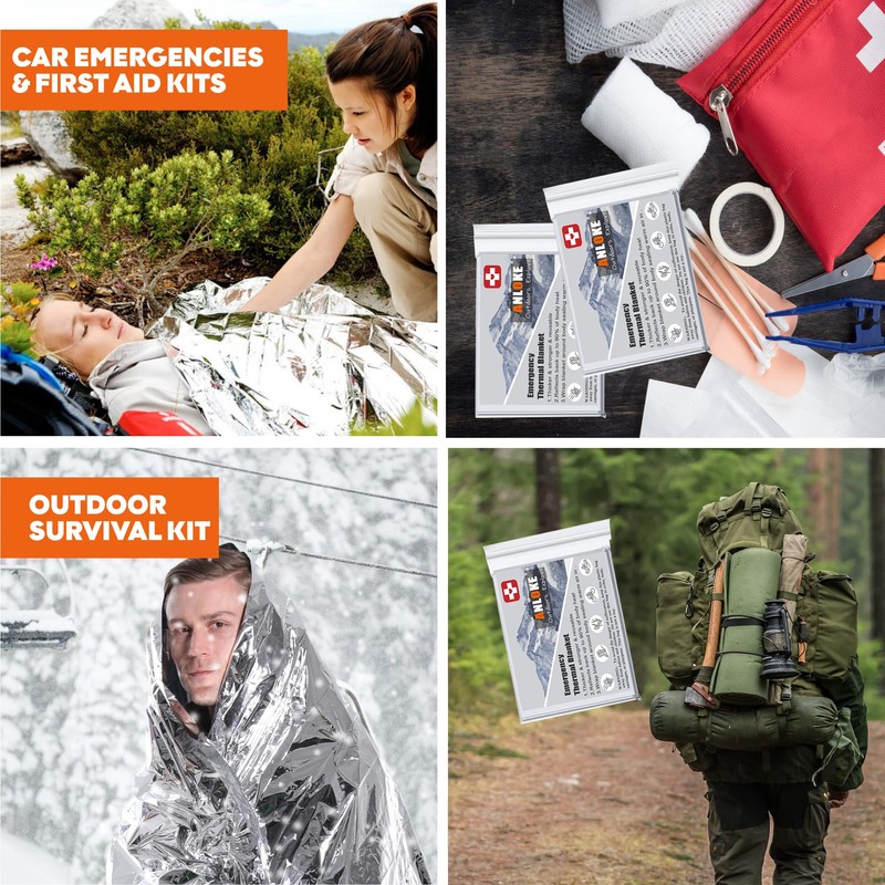 • ★BEST QUALITY★--Durable and advanced aluminized dual-sided emergency mylar thermal space blankets, survival blanket,waterproof and windproof ,it retains up to 90% of your body heat. Perfect for First Aid Kit, bug out bags, go-bags, and home/auto emergency kits.