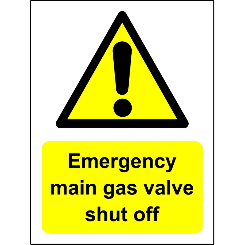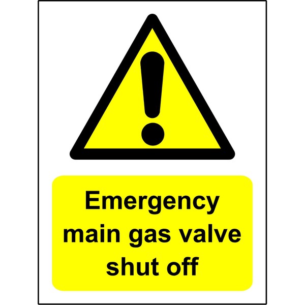 EMERGENCY MAIN GAS VALVE SHUT OFF SIGN - 1.2mm rigid plastic 150mm x 200mm