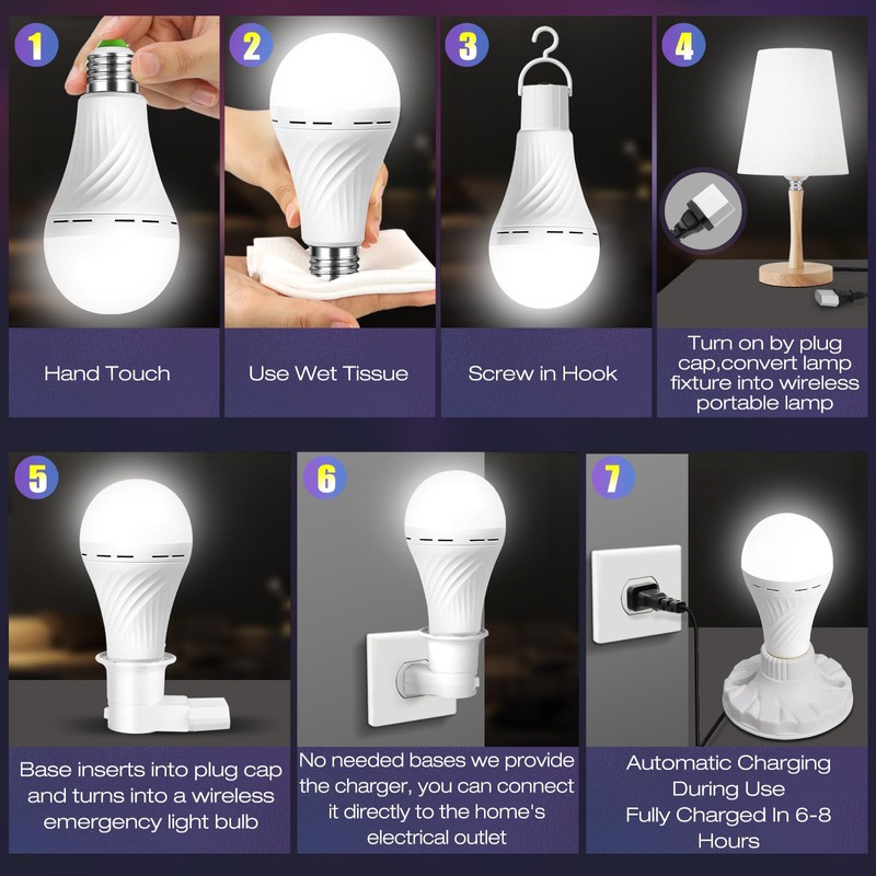 - ► [ Tool for Power Outage ]-- These rechargeable light bulbs are screw in as ordinary LED bulbs (E27/E26).Inserts can be rotated to fit different types of sockets.We provide 6* rechargeable light bulbs, 6* portable hooks, and 6* socket adapter, perfect for outdoor activity like camping,A necessity during blackout, storm, hurricane ect. and say good bye to extra candles, flashlights and lanterns.