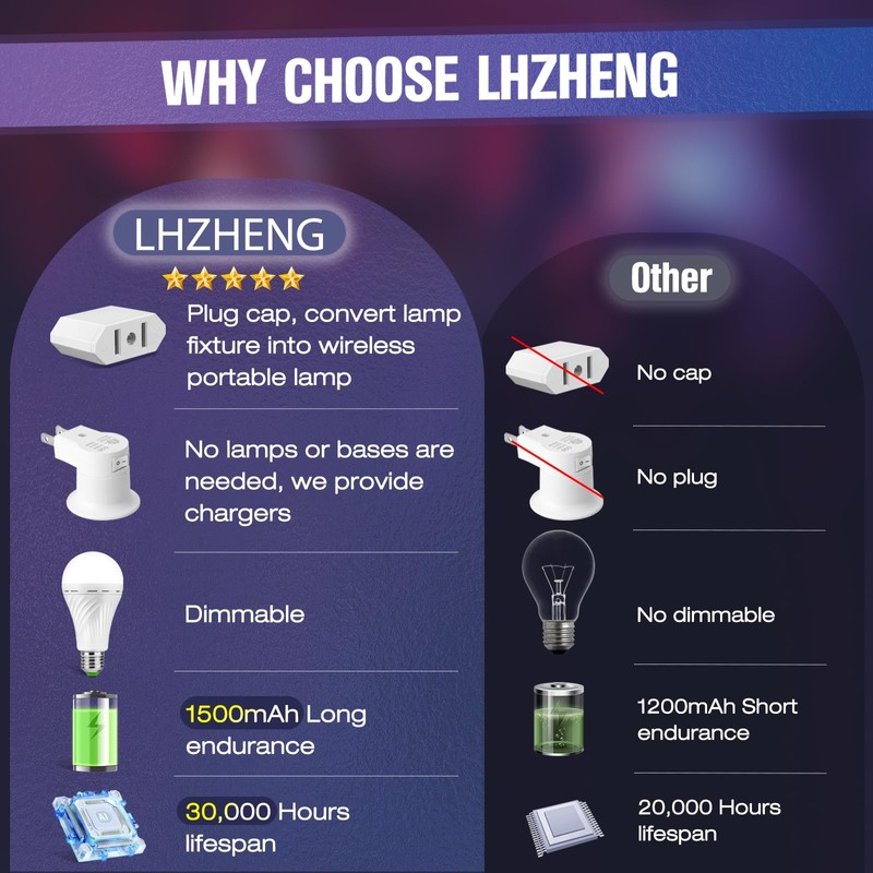 - ► [ 100%/50%/10% Brightness Adjustable ]--Battery mode lasts up to 14 hours, LHZHENG rechargeable battery bulb has 3 duration options: 2-3 hours/7-8 hours/14+ hours.100%/50%/10% Brightness is adjustable, use different brightness in different places.10% for bedroom, 50% for bathroom, 100% for living room.There are 3 ways to adjust the brightness: 1. Adjust the brightness with the button on the hook;2.Use the light switch to adjust the brightness during a power failure ;3.Adjust the brightness with the matching plug in case of power failure.