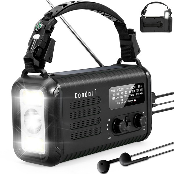 Emergency Weather Radio (Condor 1) NOAA/AM/FM with 74000mWh Portable Radio, USB-C/Solar/Hand Crank Charging, SOS Alarm, Flashlight, Reading Lamp & Survival Handle Kit for Indoor/Outdoor (Black)