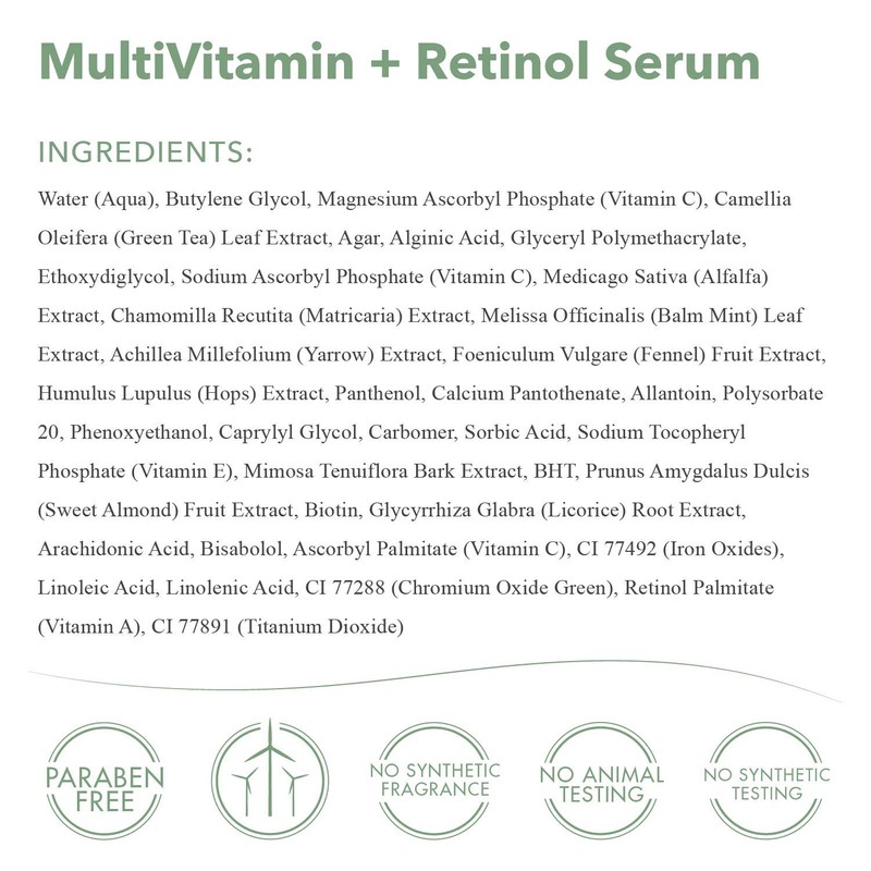 Active Ingredients Retinol (Vitamin A), Vitamins B, C, E, F & H, Alfalfa Extract, Licorice, Balm Mint, Green Tea, Sweet Almond Milk, Chamomile, Fennel, Hops, Yarrow, Allantoin, Mimosa.