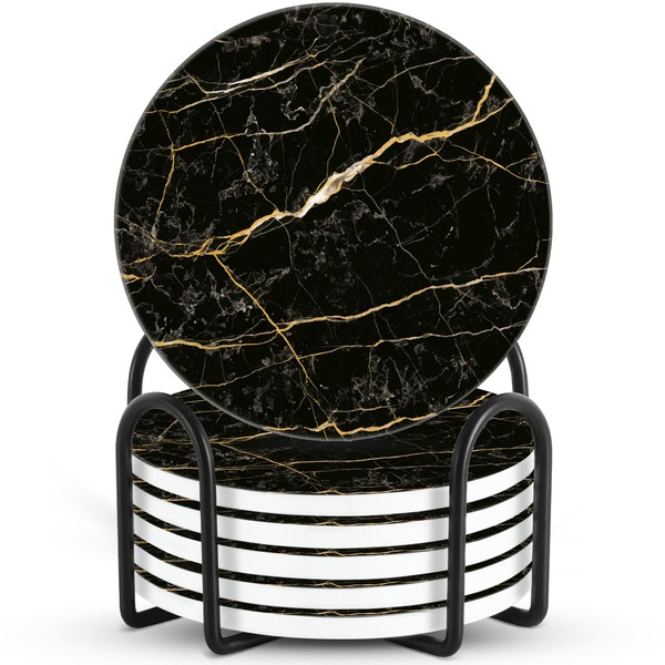Emerson Coasters for Drinks Absorbent – Natural Stone Drink Saucers Set with Holder, Coasters for Coffee Table, Wooden Tabletop Protection Marble Style – 100% Heavy Duty Set of 6 (Streak)