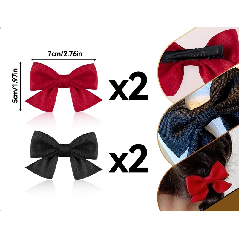 - [Setinhalt]: Das Set enthält 2 Paar Haarnadeln mit Schleife, erhältlich in Rot und Schwarz. Sie können je nach Bedarf die passende Haarnadel zum Tragen auswählen. Die Menge ist genau richtig, um Ihren Matching-Bedarf zu decken