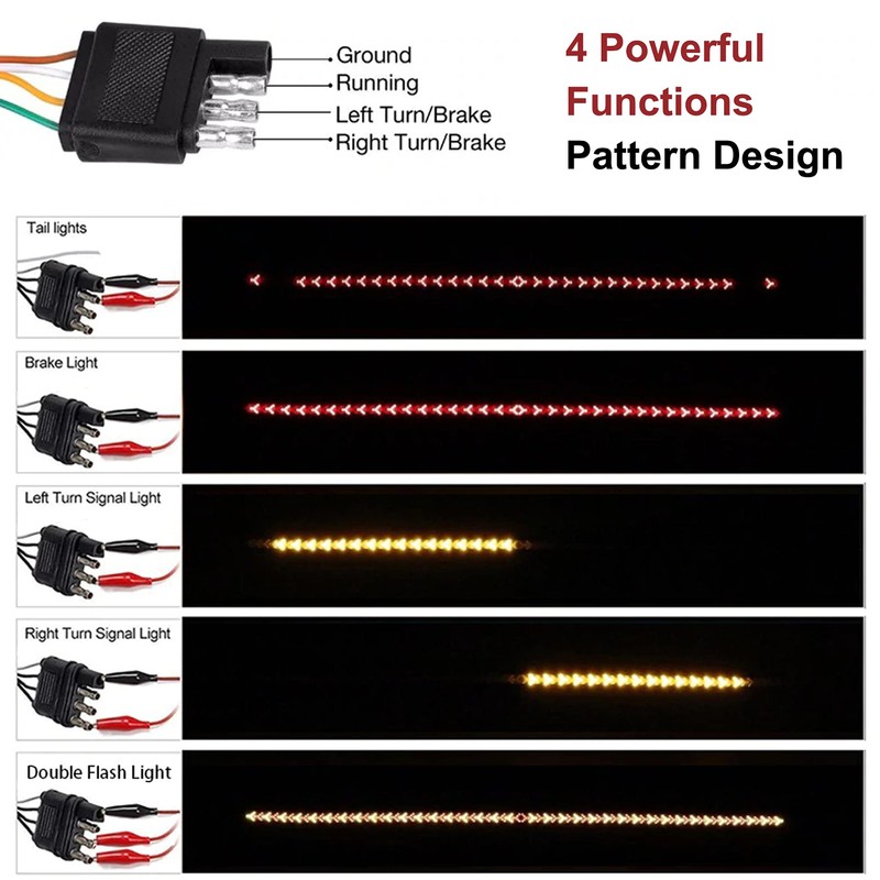 - Full Functions Light Strip - Multiple functions such as driving lights, reversing lights, brake lights, turn signal and parking lights, will add a clearer visibility to the rear drivers. Running light mode in red scan from center to side, left & right signal turn mode in amber scan single side.