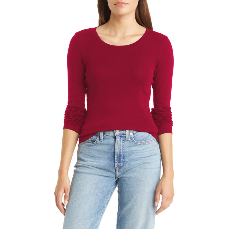 Emmalise Women's Junior and Plus Size Basic Scoop Neck Tshirt Long Sleeve Tee, Large, Red