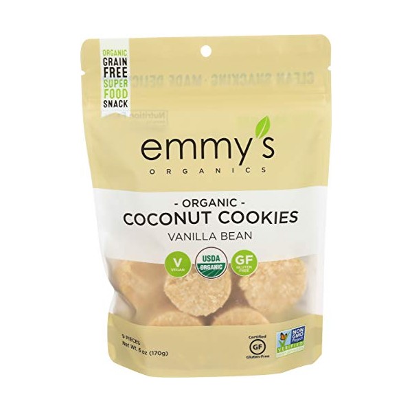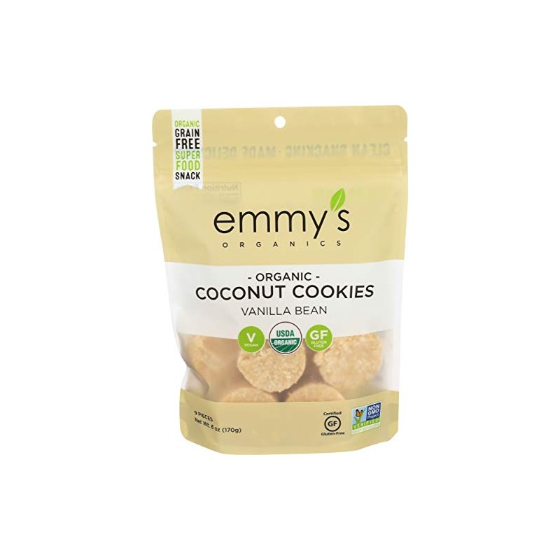 Emmy's organics vanilla bean coconut cookies feature a smooth vanilla flavor rounded out by the essence of freshly-ground almonds cold-pressed coconut oil and real vanilla bean. Our non-gmo verified cookies are a gluten-free superfood snack that tastes great. Each energy-enhancing serving contains 100 calories. Our cookies are vegan-certified and suitable for paleo diets. Includes one 6 oz. Bag of emmy's organics vanilla bean coconut cookies. See nutrition facts panel for allergens. Emmy's is a homegrown family-oriented company committed to spreading the good word about healthy snacking as well as social and environmental responsibility.country of origin : united statesis dairy free : yesis gluten free : yesis gmo free : yesis kosher : yesis vegan : yesorganic : 95%+ organicsize : 6 ozpack of : 8selling unit : caseingredients : coconut;agave nectar;almond flour;extra-virgin coconut oil;vanilla extract;vanilla bean;himalayan saltkeywords : brownie;chocolate;gourmet;healthy;homemade;natural;oatmeal