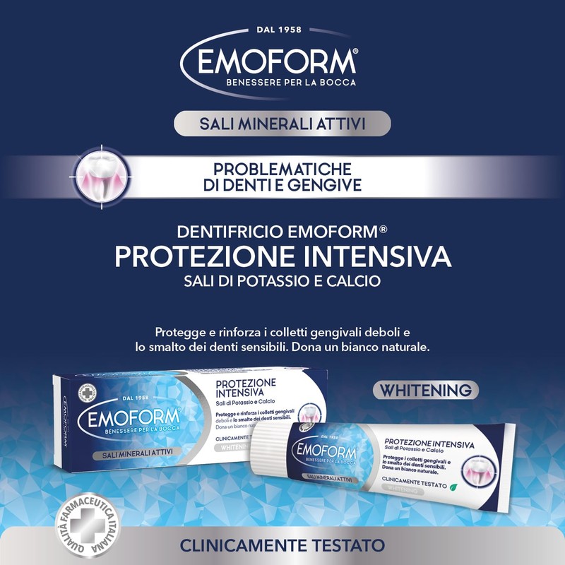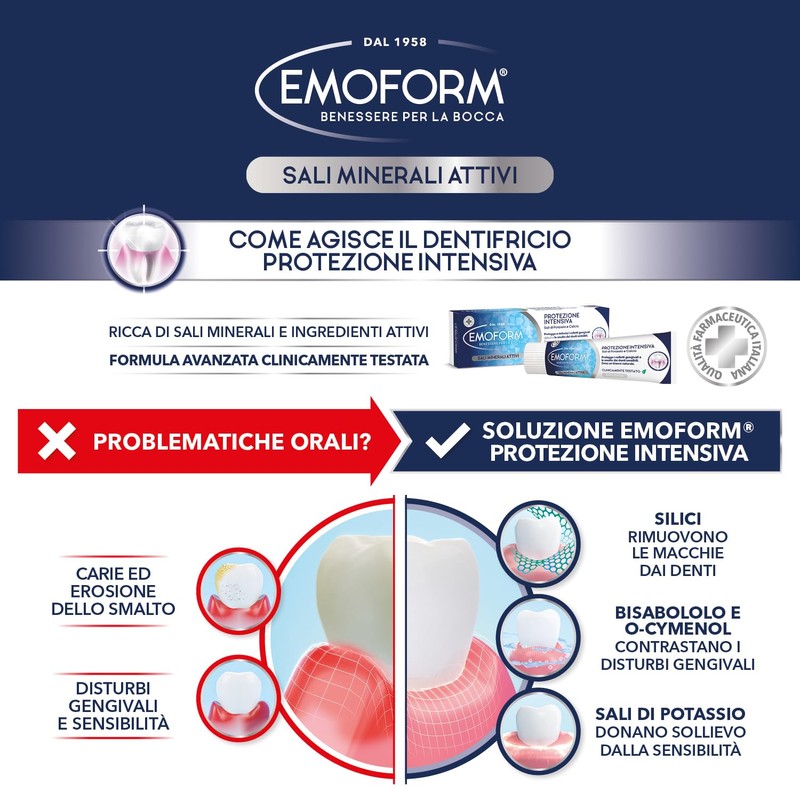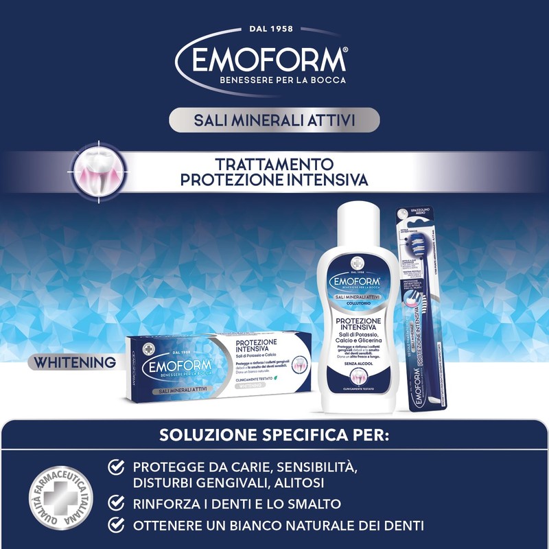 - Clinically tested formula: Emoform thanks to the power of its active mineral salts with beneficial properties on teeth and gums, Emoform is the perfect solution for the protection, prevention and well-being of the entire mouth. Italian pharmaceutical quality. Made in Italy.