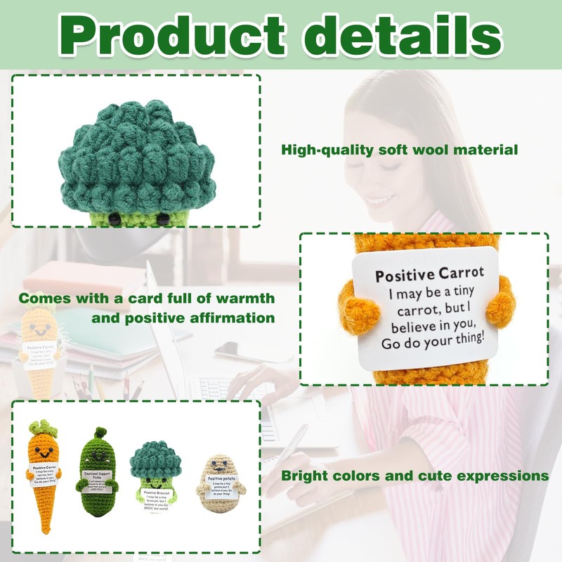 Emotional Support Plush Set – 4-Piece Knitted Vegetable Dolls with Positive Messages, Includes Carrot, Cucumber, Potato & Broccoli, Soft Yarn Material, Ideal for Desk Decor, Gifts & Stress R