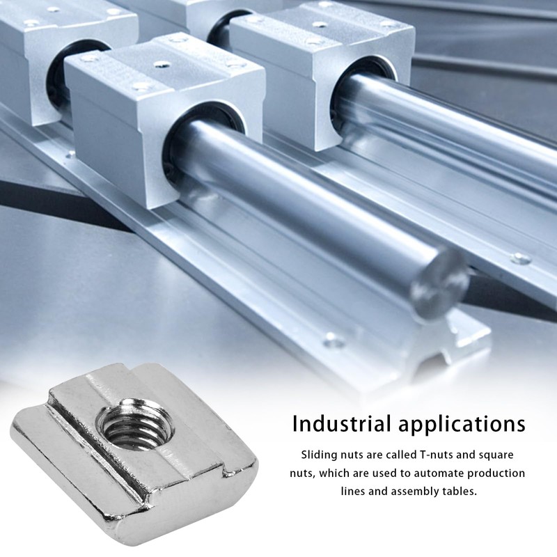 - Features: Sliding nuts are characterised by a unique design that allows easy insertion into T-slot rails from the end profile and ensures reliable and secure attachment. Square nuts are easy to install and remove and are widely used for various industrial and commercial purposes.