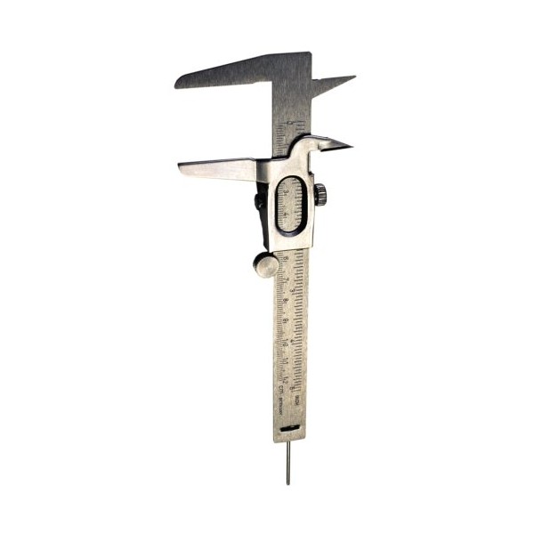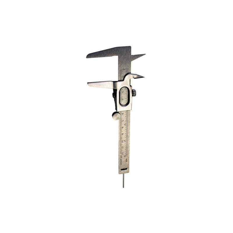 This fractional scale vernier caliper is graduated in 16ths-Inch and millimeters. (1/10mm) Easy to glide roller with friction stop. This economical steel vernier caliper has a 5-Inch capacity with 3 way measuring inside, outside and depth.