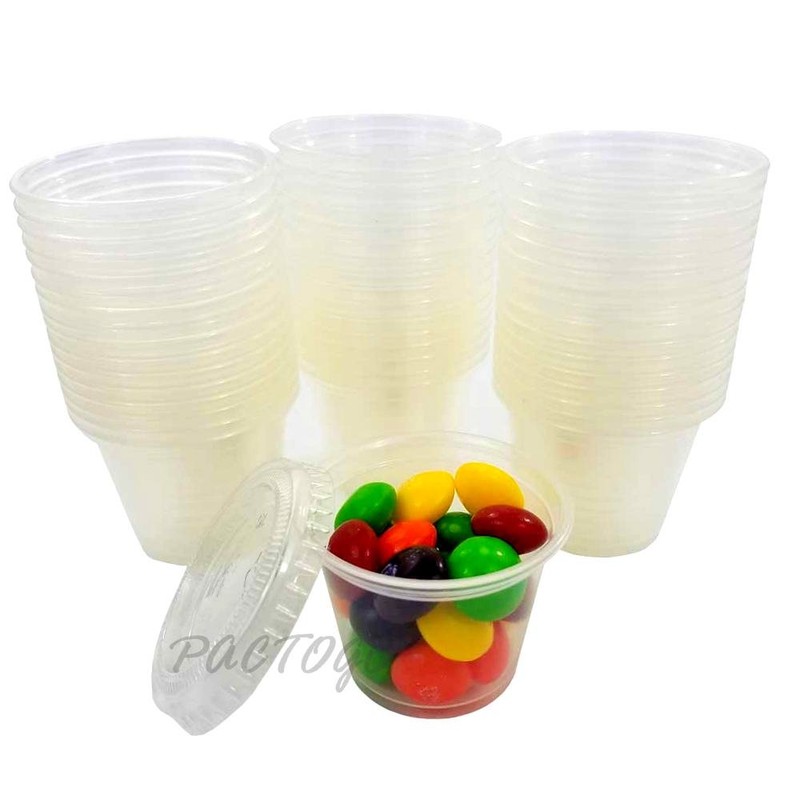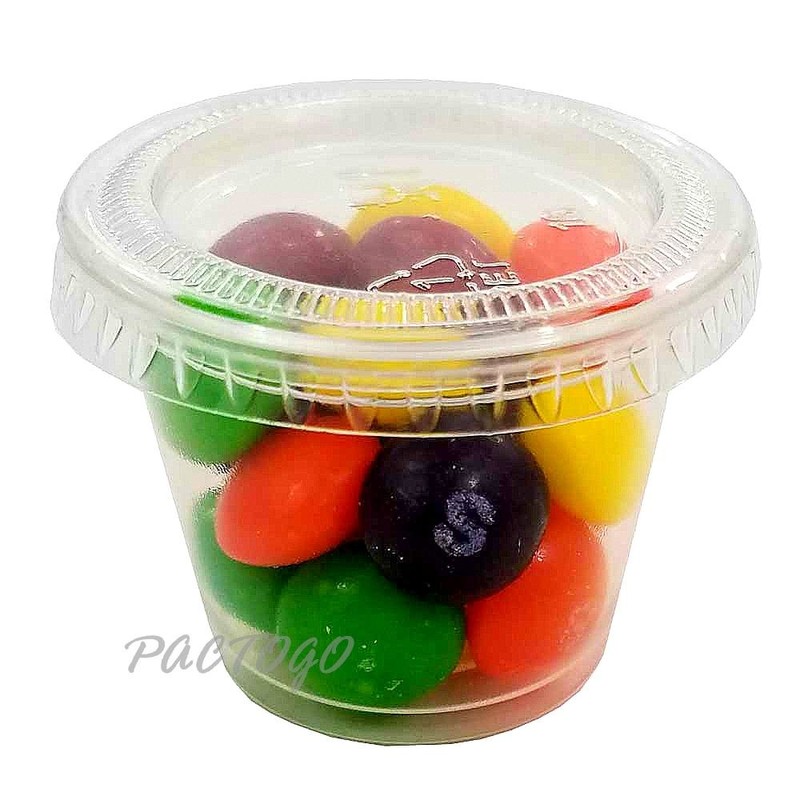 Empress brand 1.0 fl.oz Capacity. Dimensions: 1-11/16" Top Out x 1-1/4" Depth x 1-1/8" Bottom. Lids Provide a Tight Seal, Prevents Leakage Made with High Quality, Clear Polypropylene (PP5), Lids made with Clear/Translucent PETE