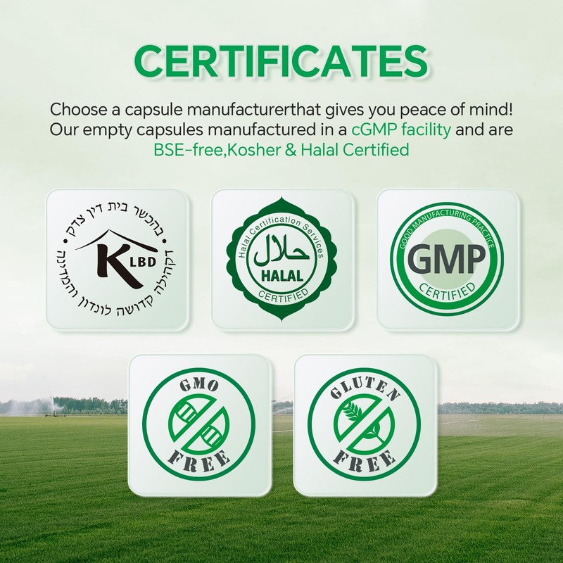 - Safe and reliable: Choose from convenient 100, 500, 1000, and 5000 count bulk options. High-quality empty capsules are made from safe, non-toxic materials, Our capsules have been certified byISO9001, Gluten Free, Vegetarian Vegan, Made With Non GMO Ingredients, Certified KOSHER, Certified HALAL, Allergen Free, etc.ensuring that you can trust the quality and safety of the fill capsules you create.