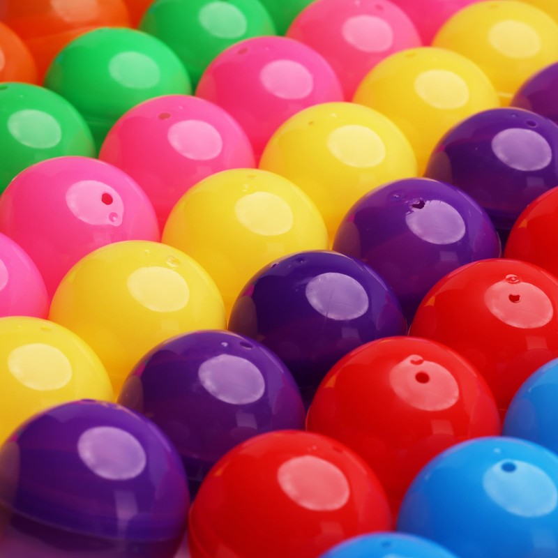 - Plastic Empty Tiny Multicolored Round Capsules for toy vending machine, size: 2 inch/50mm; number of bottoms and tops of the same color doesn`t match, you will not get all the capsules of solid color