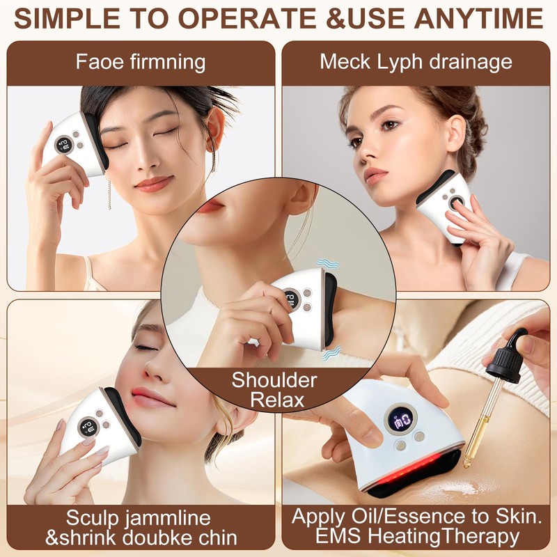 - [Versatile Full Body Care] Our Ems gua sha is perfect for treatments of the face, back, abdomen, neck and arms. High frequency vibration and heat therapy relieve deep muscle tension. You can add essential oils and the facial massager promotes the penetration of the ingredients into the skin. Whether your muscles are aching or relaxed, with this device you can enjoy professional treatments for all your needs!