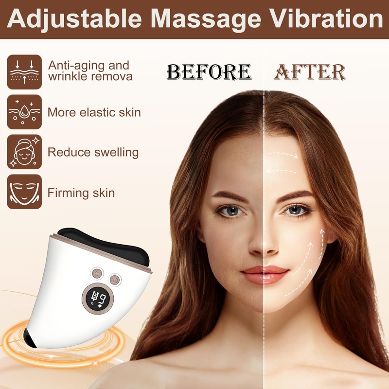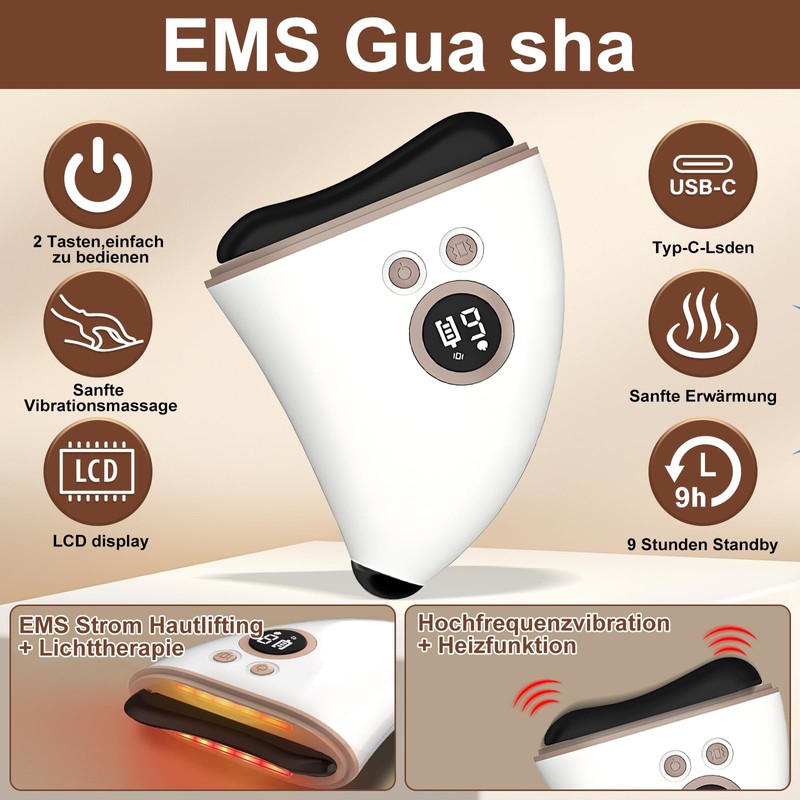 - [4-in-1 multifunctional Gua Sha] This face massager combines the powers of EMS microcurrent, light therapy, vibration and heat care This EMS facial massager device activates deep skin cells, increases elasticity and makes your skin look firm, shiny and youthful. Whether you want to refine pores, lift or relax the skin - all wishes for perfect skin care are implemented here