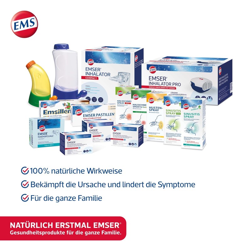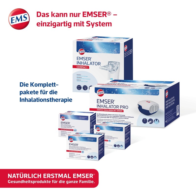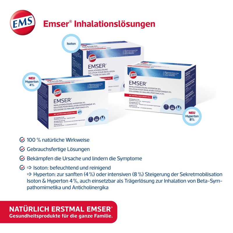 - EMSER INHALATION SOLUTION HYPERTON 4%: For osmotically conditioned, gentle increase of secretmobilisation through mucus liquefication.