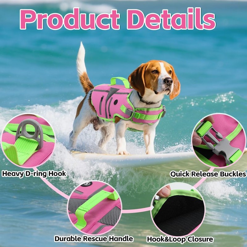 - 【Versatile and Convenient Design】The dog flotation vest is designed with adjustable belts, quick-release buckles and underbelly with Wide Hoop&Loop areas, which make dog safety lifesaver easy to put on and take off, and create a most comfortable state for your dogs. And the reinforced D-ring hook of the pet life jacket is perfect for dog leash. And the dog water vest is also with durable handle, which it is easier for you to grab your dog out of water.
