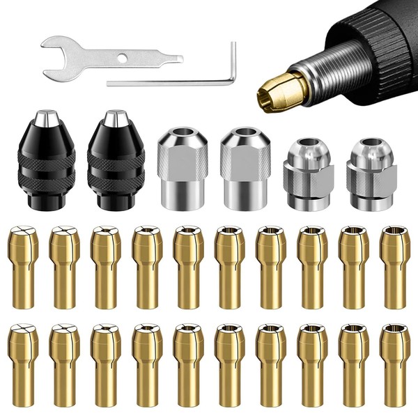 - 【PACKAGE CONTENT】You will receive 4pcs silver nuts, 2pcs British 1/32 to 1/8inch 4486 3-jaw chucks, 20pcs brass collets(10 sizes, each size 2pcs), 1pc wrench and 1pc L-shaped wrench, practical combination set, enough for daily use.