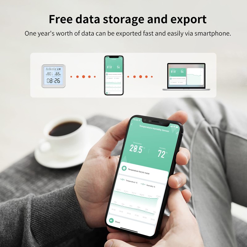 - Store data and export for free: the temperature and humidity sensor are synchronised with the app, free storage of 1 year records, you can export data in CSV format by email to identify long-term historical trends over time for the interior, baby room, greenhouse, bedroom, wine cellar and more