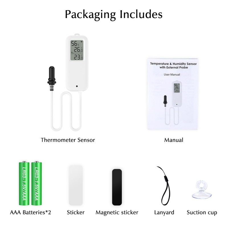 - Hygrometer parameters: temperature measurement range -9.9℃~60℃, accuracy ±1℃. Humidity range 0%~100%RH, accuracy ±5%RH. Smart Life app supports calibration of temperature and humidity, size 7.1 x 2.5 x 2.0 cm, weight 50 g, built-in 2 AAA batteries, support WiFi 2.4 GHz.