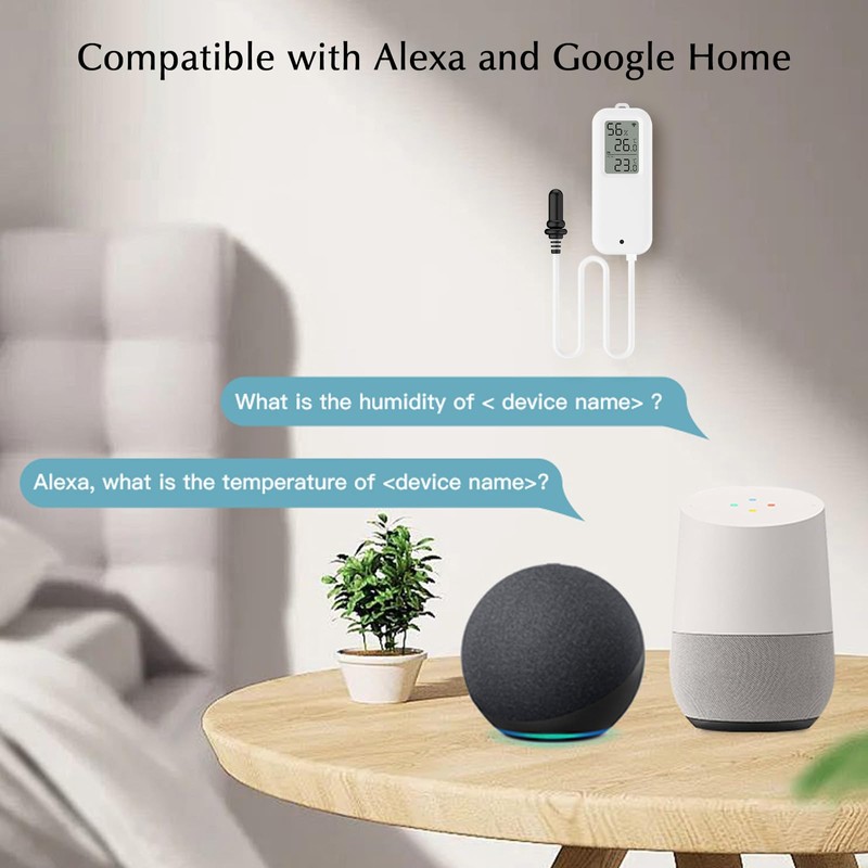- Voice Support You can query the ambient temperature and humidity through the voice dialog of Alexa, Google Assistant and other smart speakers. For example: "Alexa, what is the temperature of the ''device name".