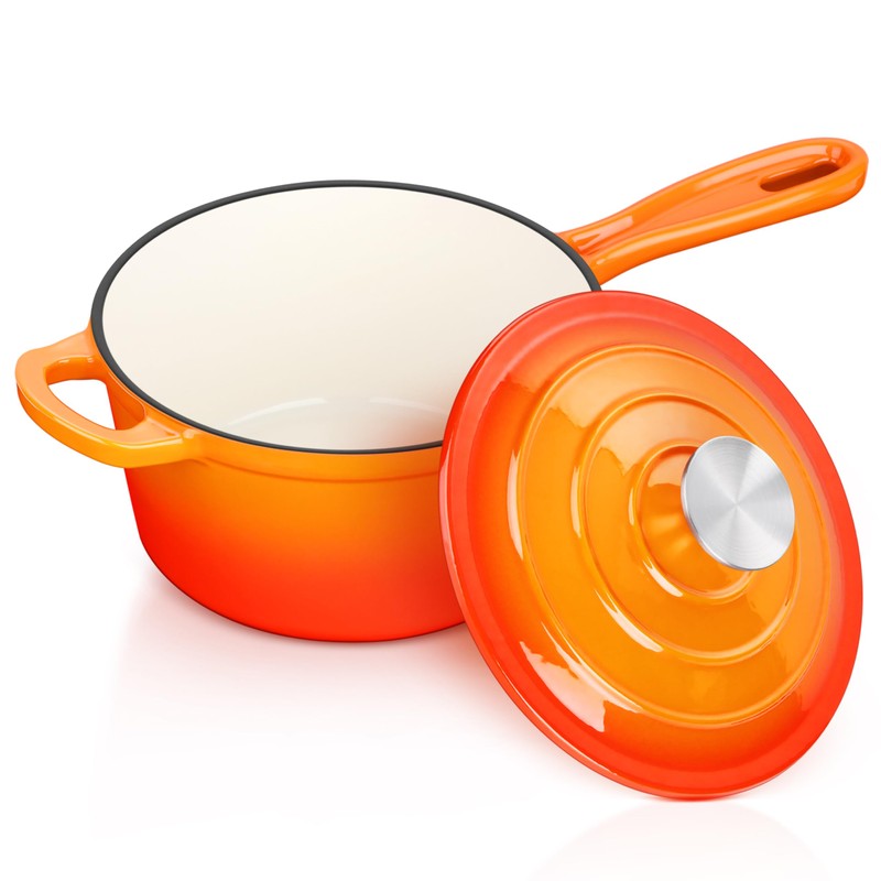 - HEAVY DUTY & SAFE, cast iron sauce pan is made of cast iron core and 3 layers of non-stick enamel coating inside and outside, creating a non-stick and crack-resistant interior to ensure that the enamel doesn't peel off and lasts a long time
