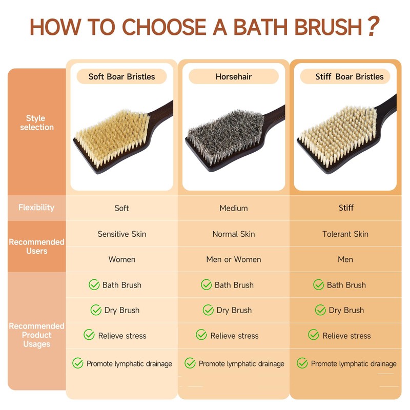 - Bristle Selection & Adaptability: When used for dry brushing, it unclogs pores, boosts blood circulation, alleviates stress, and keeps skin feeling refreshed daily. In the shower, it delivers deeper exfoliation. Ideal for dry, rough skin and other skin concerns.