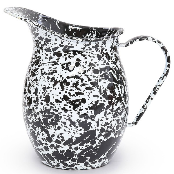 Small, 1 quart splatterware pitcher with large pour spout. Pitcher stands 7 1/4" tall and has a 4" diameter at the top. High quality steel construction with a baked on porcelain enamel finish makes it easy to clean, too. Enamelware is not intended for microwave use. Dishwasher safe, do not leave in standing water. Great for home, campsite, RV, poolside or picnics!