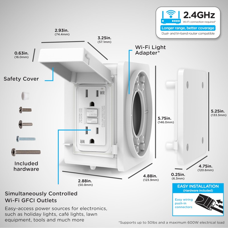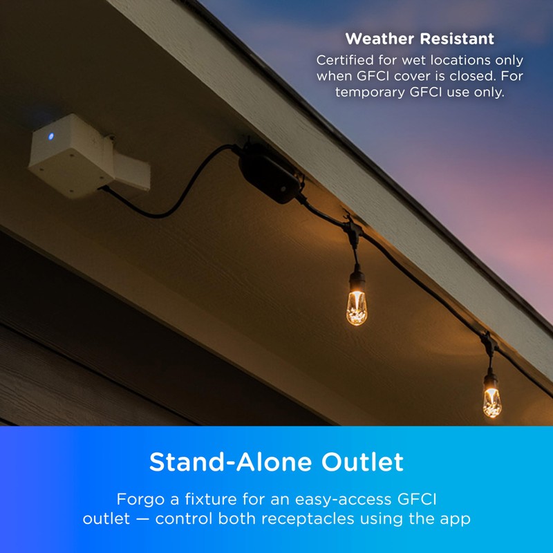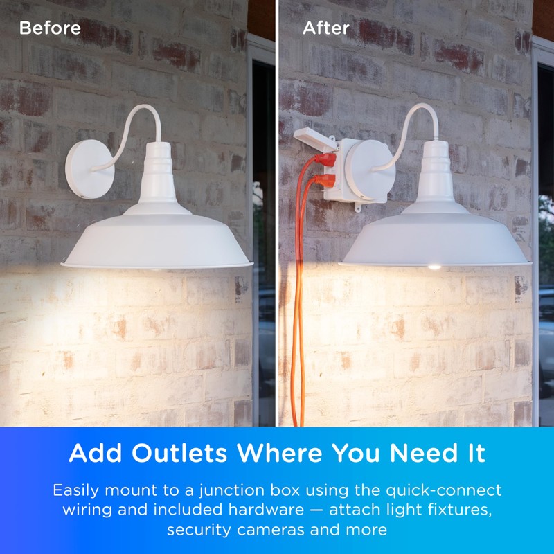 - Junction Box Adapter – Mount the smart adapter to your junction box to upgrade your outdoor electrical system; features two GFCI receptacles and the ability to mount an additional 600W, 50lb light fixture or device