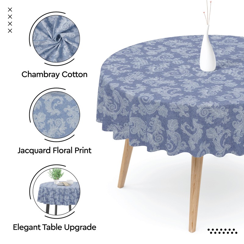 Encasa 4 Seater Dining Table Cloth 145 cm-Round (57 in-Round) I Floral Jacquard Style Print on Chambray Homespun Cotton I for Family Gatherings, Parties I Washable