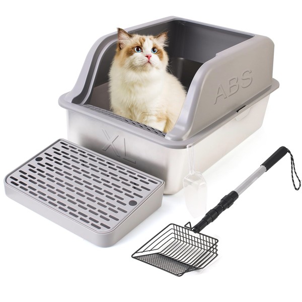 Enclosed Stainless Steel Cat Litter Box with Lid, XL Extra Large Litter Box for Big Cats, Metal Litter Box High Sided, Never Absorbs Odors, Anti-Urine Leakage, Including Long Handle Scoop