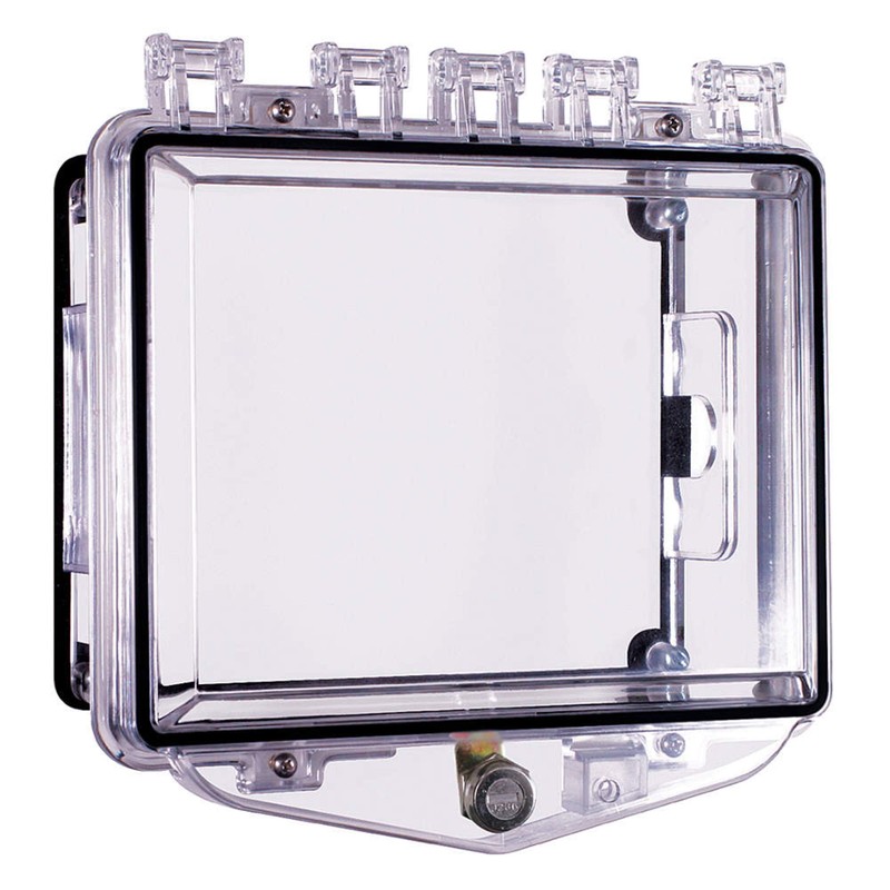 - Price For: Each Material: Polycarbonate Includes: Open Conduit Back Box, Exterior Key Lock, Gaskets, Mounting Hardware Features: Clear Polycarbonate, Multipurpose Lockable Enclosure Helps Protect Large Units Against Physical or Environmental Damage Item: Enclosure Width: 10" Height: 10" Depth: 4-1/2" Mounting: Surface Operating Temp.: -40 Degrees to 250 Degrees F Color: Clear