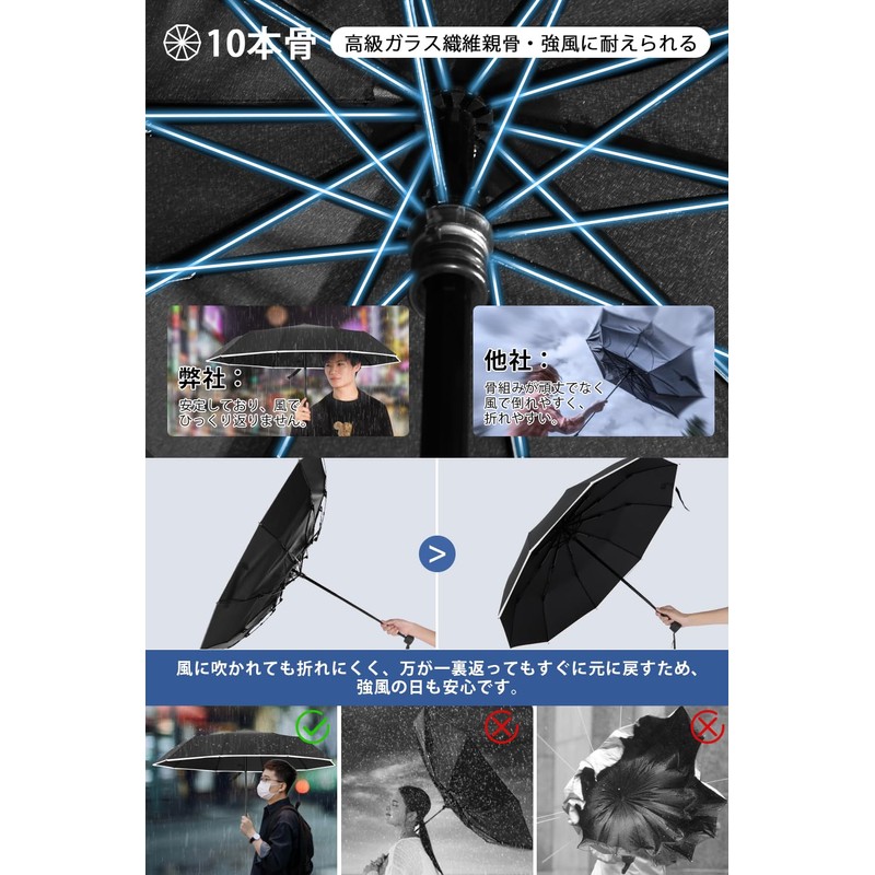 - Durable and strong 10 ribs that are resistant to strong winds and heavy rains: 10 folding umbrella ribs are made of military-grade aluminum alloy and glass fiber. It is highly durable and resistant to breakage even in strong winds. 10 ribs made of improved fiberglass can withstand wind speeds of 39.1 ft/s (14 m/s). When the wind gets inverted or inverted, the folding umbrella can be easily returned by closing it as usual. The umbrella cloth is made of high density polyester material and the surface is coated with Teflon water repellent coating to keep you dry even in heavy rain. Portable and convenient, you can always keep it in your bag and use it for heavy downpours. Handle: High textured ABS resin
