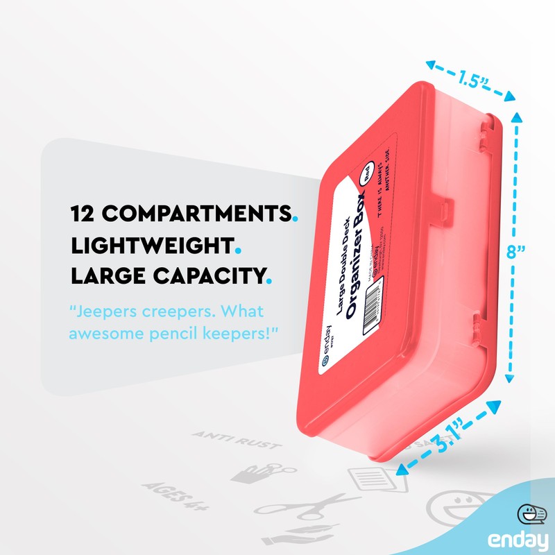- ✓SPECS – Our double-deck pencil box has 12 compartments 6 on each side, easily accessible and solid construction. This supply boxes size are 8.5 x 5.75 x 2.5. The pencil boxes are the best you can choose for you to keep their favorite pens and pencils neatly organized.