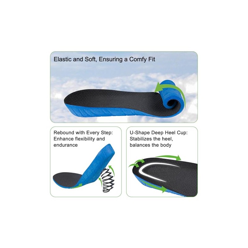 - Comfortable & Supportive: Our insoles are designed to align with the foot's natural geometry, ensuring even impact distribution, enhanced stability, and improved control. Featuring arch support and a deep heel cup, they provide a premium fit for dynamic activities, including prolonged standing, walking, or running.