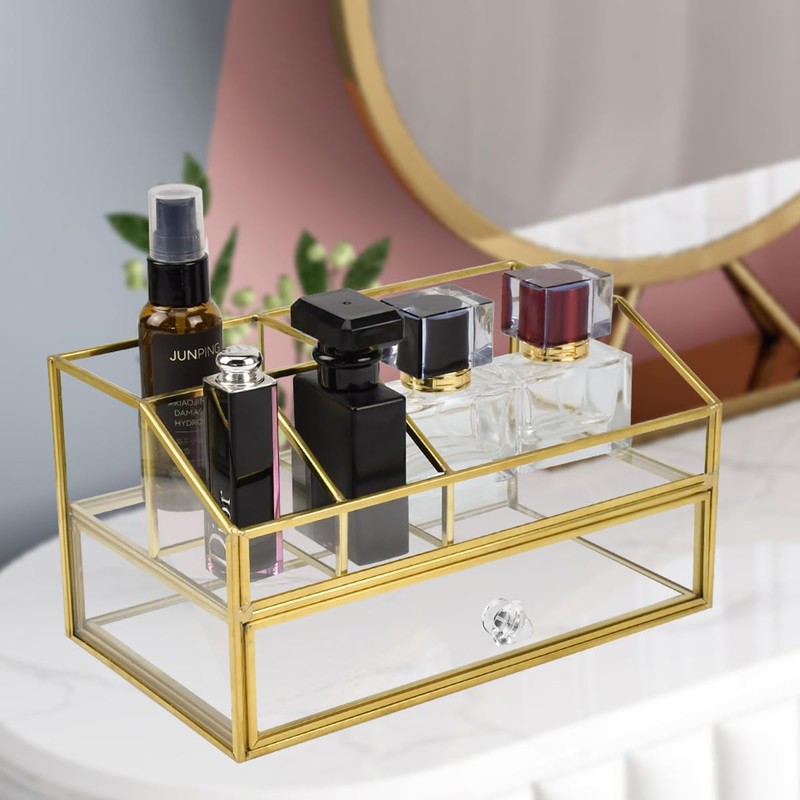 - Material: Makeup brush holder organizer is made of thick glass and encircled by golden brass, which is durable, chic and elegant. Coordinate beautifully with most décor and easy to maintain.