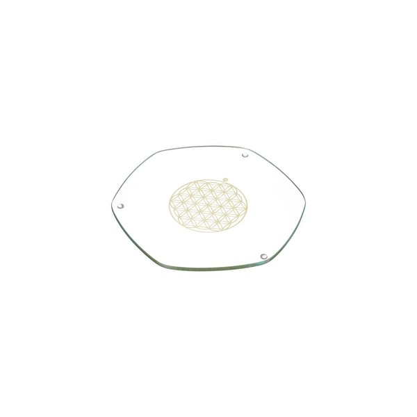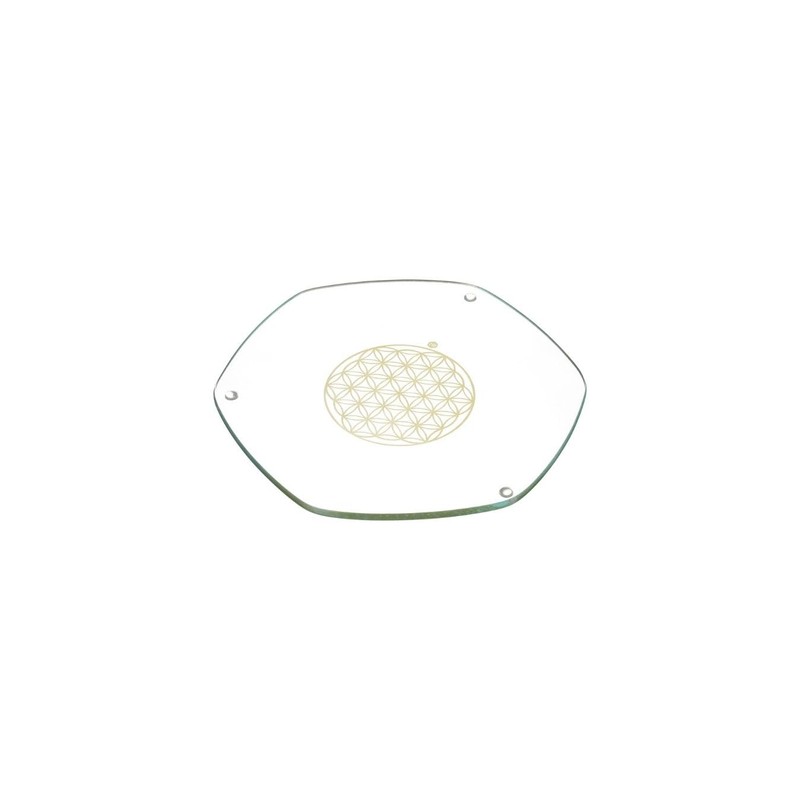 With the flower of life made of 23.8 carat gold, which was baked into the glass at about 600°C.