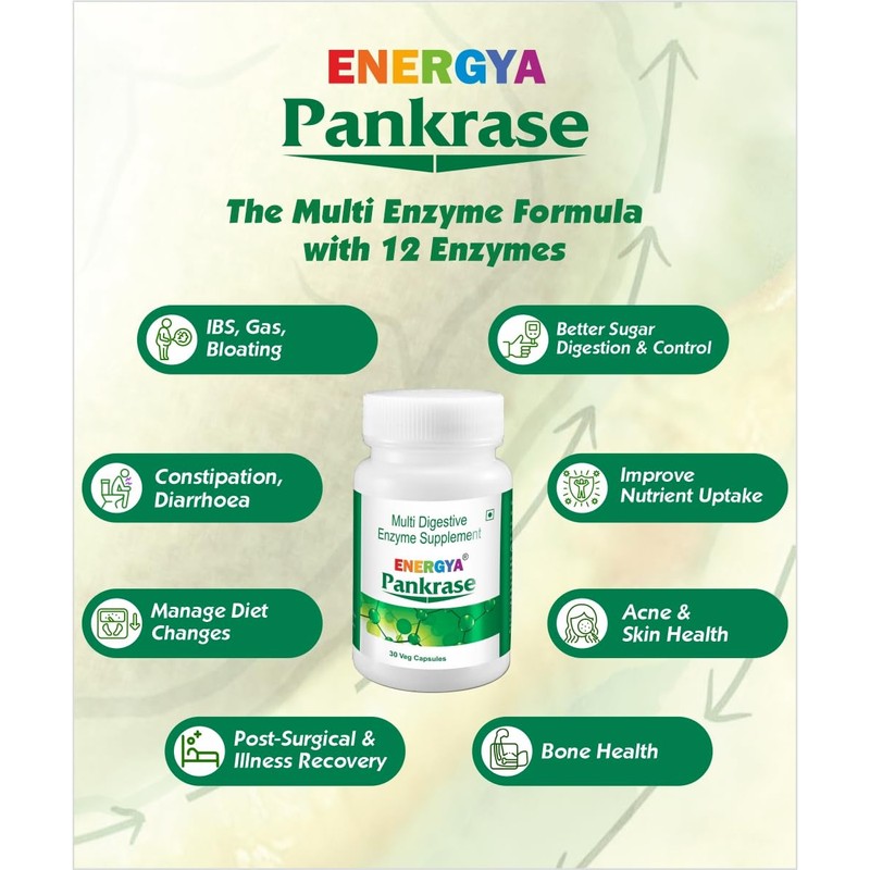 - The enzymes in Energya Pankrase help in the breakdown of proteins, carbohydrates, fats and fibers to produce essential fatty acids, amino acids, glucose and vitamins.