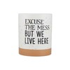 - DESIGN: features a splatter paint style and wording that reads "Excuse the mess but we live here"