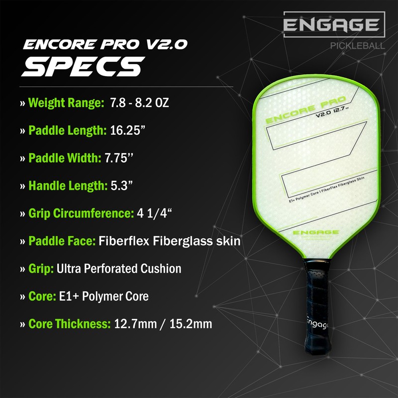 - Hybrid Shape for Versatile Play – Measuring 16.25" x 7.75" with a 5.3" grip length, the Encore Pro V2.0 offers an ideal balance of power, spin, and control, making it perfect for players who enjoy a mix of powerful drives and soft touch shots.