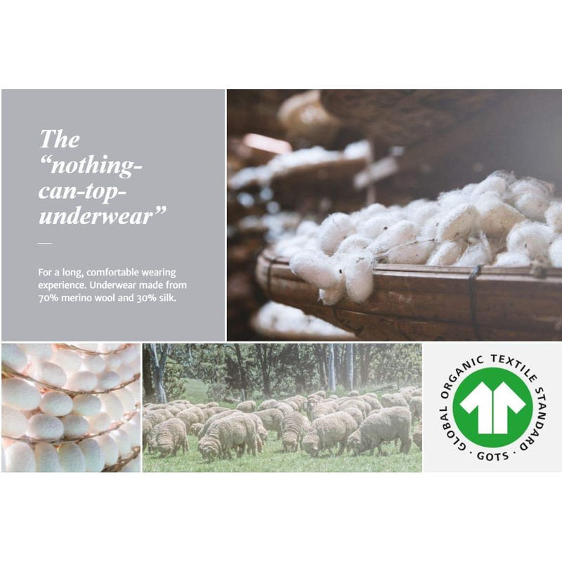- 70% organic merino wool, 30% silk. VERY THIN soft material.