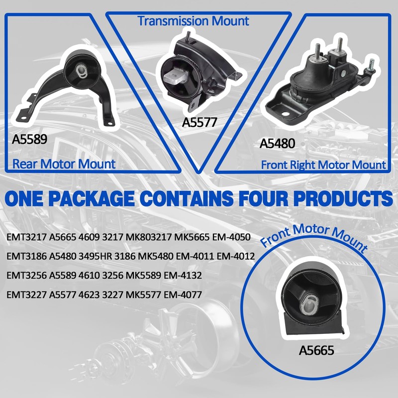 - Replaces Part Number:Motor Front Motor Mount:A5665 / Emt3217;Front Right Motor Mount:A5480 / Emt3186;Rear Motor Mount:A5589 / Emt3256;Transmission Mount:A5577 / Emt3227