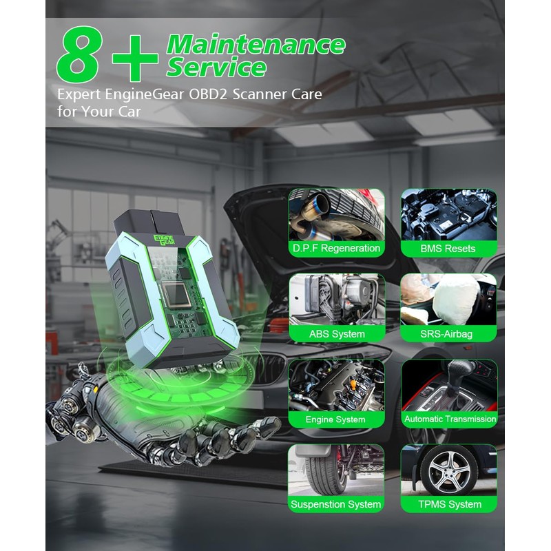 - Advanced Special Functions:EngineGear OBD2 scanner includes oil service reset, EPB (Electric Park Brake) reset, battery adjustment, DPF regeneration, injector coding, and suspension/lamp adjustments. Ideal for mechanics and DIY users, it reduces repair time and costs significantly.