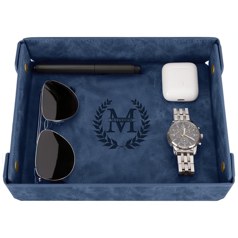 Engraved Leather Valet Tray for Men – Personalized Catchall with Custom Name for Desk, Dresser, Nightstand – Men's Organizer Tray for Keys, Wallet, Jewelry, Personalized Gift for Home, Office - Blue