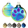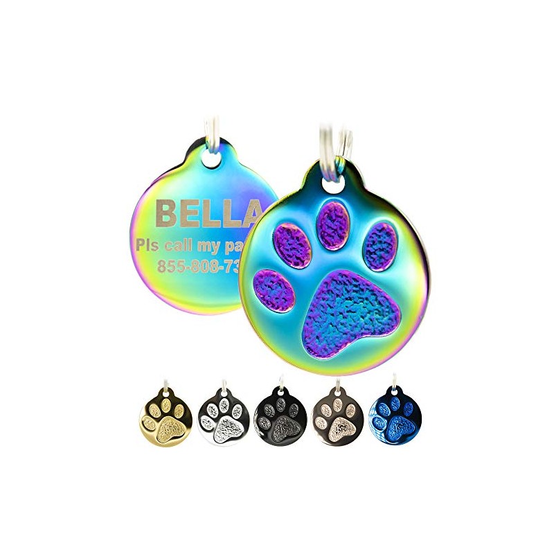 - Our engraved round paw print dog cat tags personalized solid stainless steel have color plating in Gold, Rose Gold, Blue, Black, Nebula are incredibly durable and long-lasting.