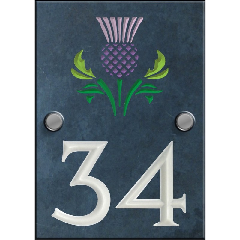 Engraved Slate House Number Sign Plaque with Hand Painted Motif - Scottish Thistle