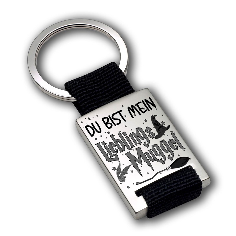 Engraved stainless steel key ring with textile band, "Du bist mein Lieblings Muggel", love key ring as a lucky charm for your sweetheart, car pendant, Textile band