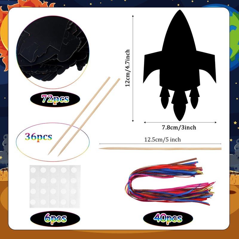 • Complete and Sufficient Set: the package comes with a comprehensive set of 72 outer space black scratch paper for kids, 36 wooden sticks, 36 ribbons, and 6 sheets of dot stickers; The black scratch paper for kids has 12 different styles, each of 6 pieces; This inclusive package ensures that children have everything they need to enjoy hours of creative fun; There are enough shapes and sizes to suit your demands for artwork, and you can even share some with your loved ones
