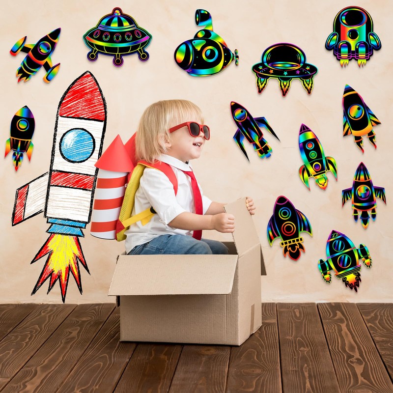 Engrowtic 72 Pcs Rocket Scratch Cards for Kids, Space Crafts Outer Space Scra...